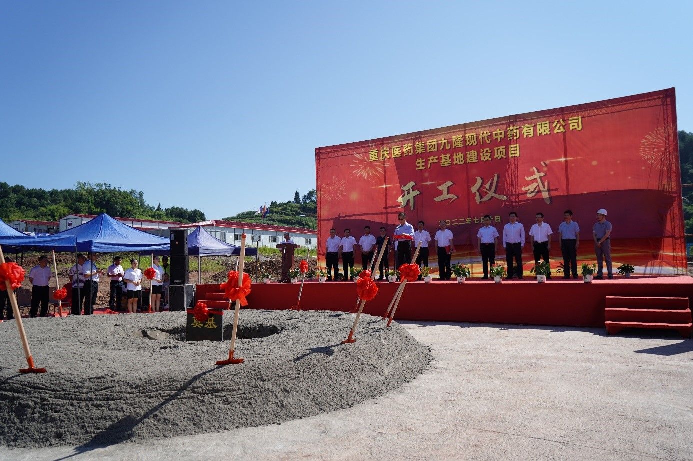 7月10日,重庆医药集团九隆现代中药有限公司生产基地奠基开工。该项目由太阳成集团tyc122cc与重庆医药集团携手建设。太阳成集团tyc122cc总裁赵炳祥、副总裁王进元、国药事业部总经理钱伟,重庆市南川区区委副书记、区长施崇刚,重庆医药集团总裁袁泉等出席开工仪式。