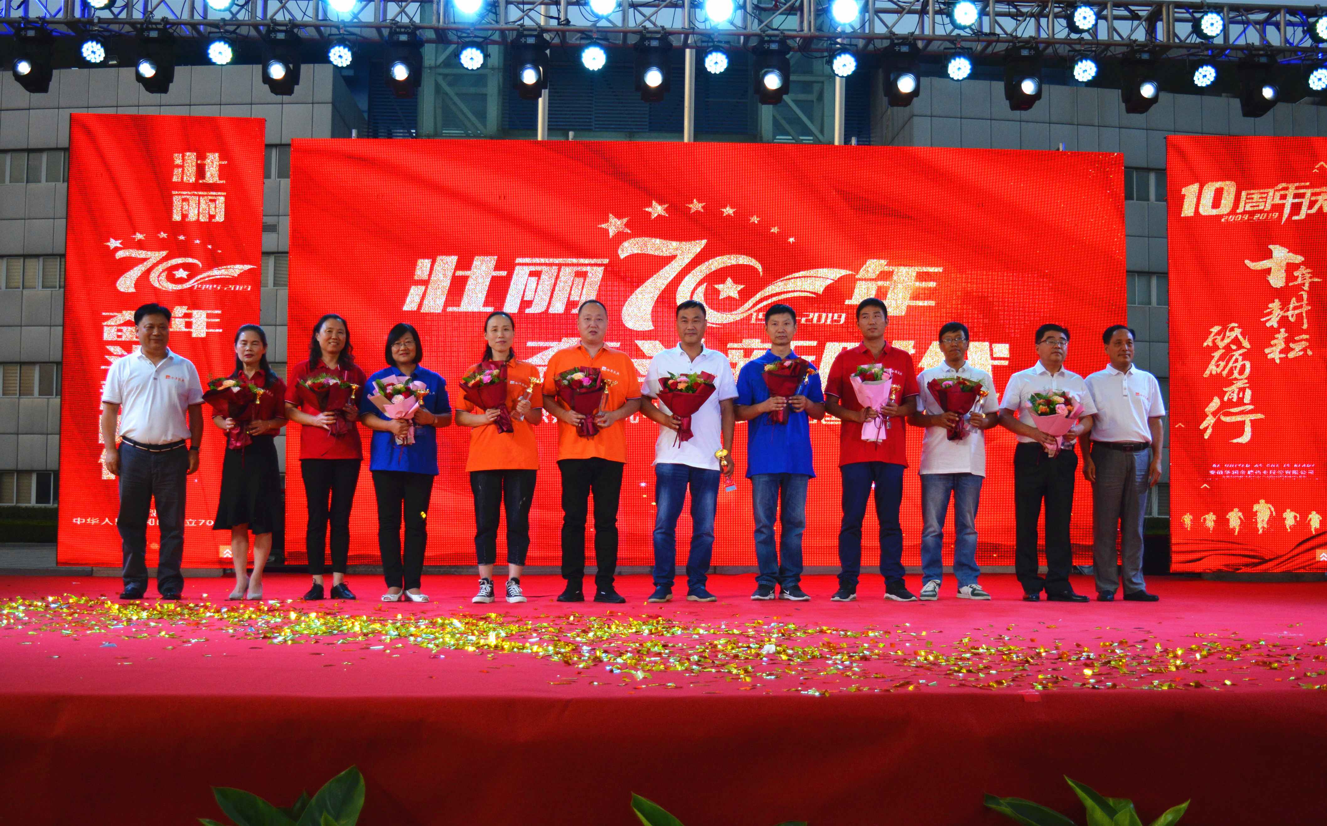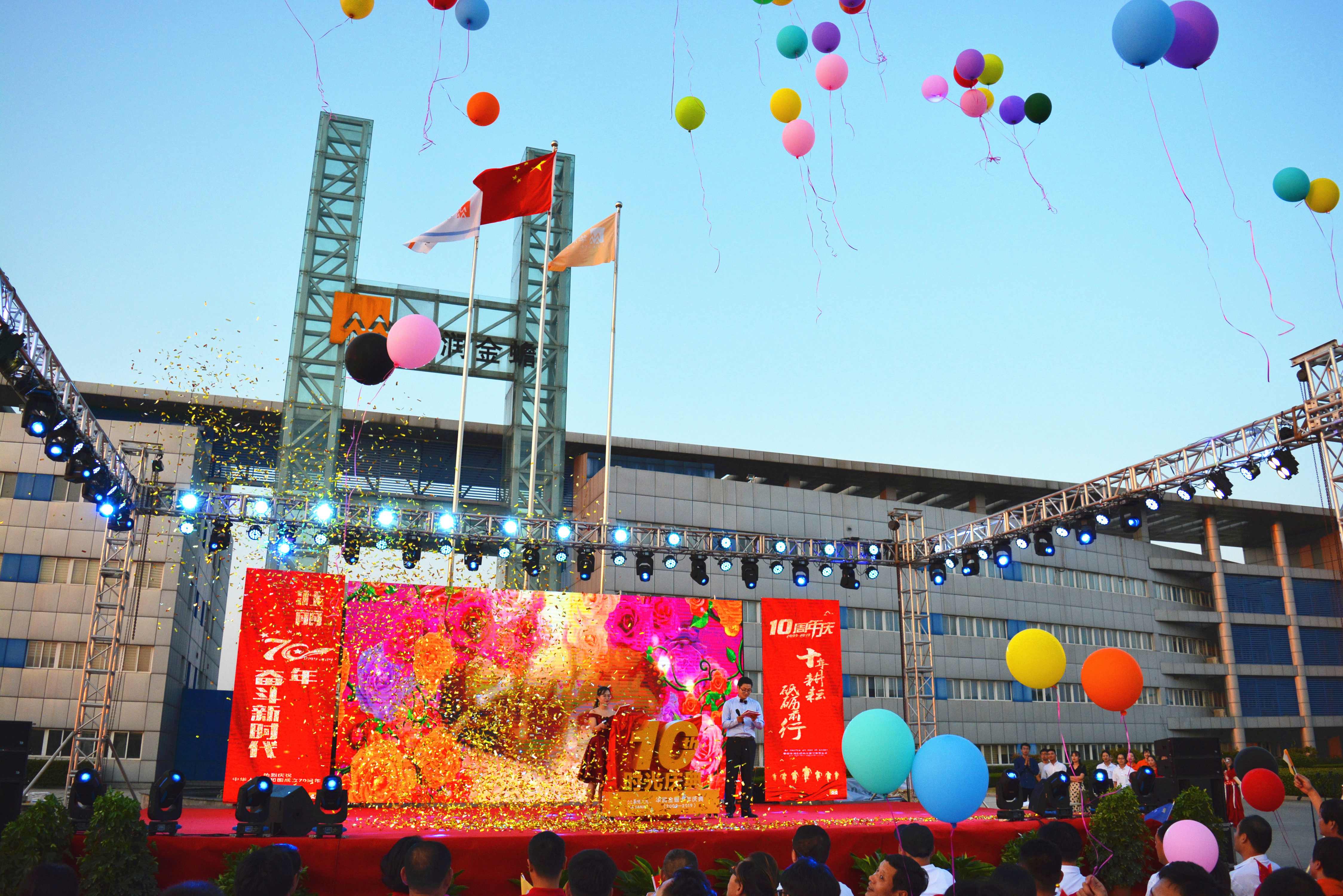 9月29日,在庆祝中华人民共和国成立70周年之际,华润金蟾加入太阳成集团tyc122cc“十周年庆典晚会”激情举行,晚会主题为“十年耕耘·砥砺前行”。公司管理团队成员、已退休的部分老领导、兄弟单位的特邀嘉宾和来自公司各车间、各部室的270余名员工欢聚一堂,共同见证这一难忘的时刻。